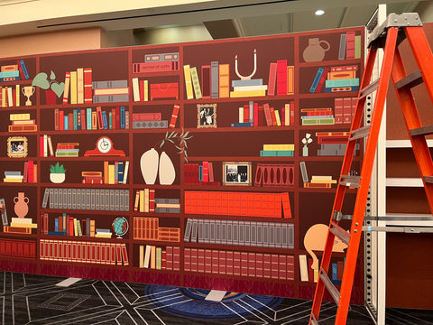 The 2024 Convention Career Fair Booth: Because in 2023, ALPFA's booth was a kitchen, we decided that this year's booth needed to move to another room of the house. With the theme of Re{frame} Your Story, a library/office was the perfect choice. Due to size constraints within the career fair space, the ALPFA booth was actually outside the career fair hall in the pre-fuction space which actually doubled the size of our booth - it ended up being almost 60ft long. I broke it into two sections, a full library wall and a photo frame wall with pictures from past ALPFA conventions. To break up the space I included a photo op that played on the theme with the bracket frame for people to stand. There were two hightop tables and chairs as well as a full seating area in the booth that allowed for attendees to meet and gather during the whole of the convention. The space needed to be exteremely flexible as not only was in the hall, but it also served as the space where meet-and-greets with prominent speakers took place. All in all, the space was well recieved and served its purpose.</p>